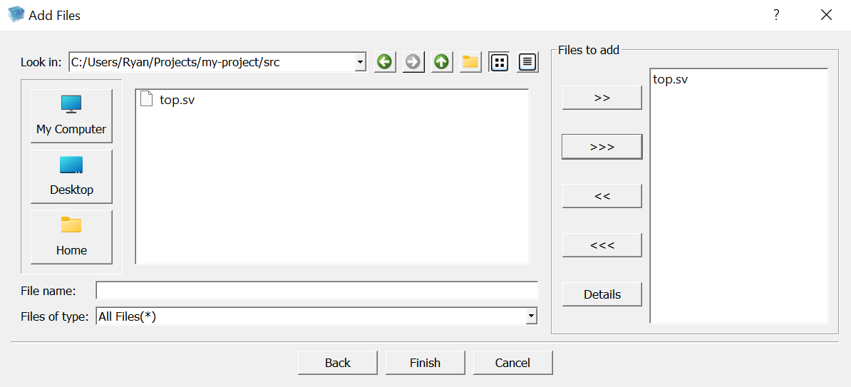 srcdirectory using the>>button. You only need to select the files that will be used for synthesis.